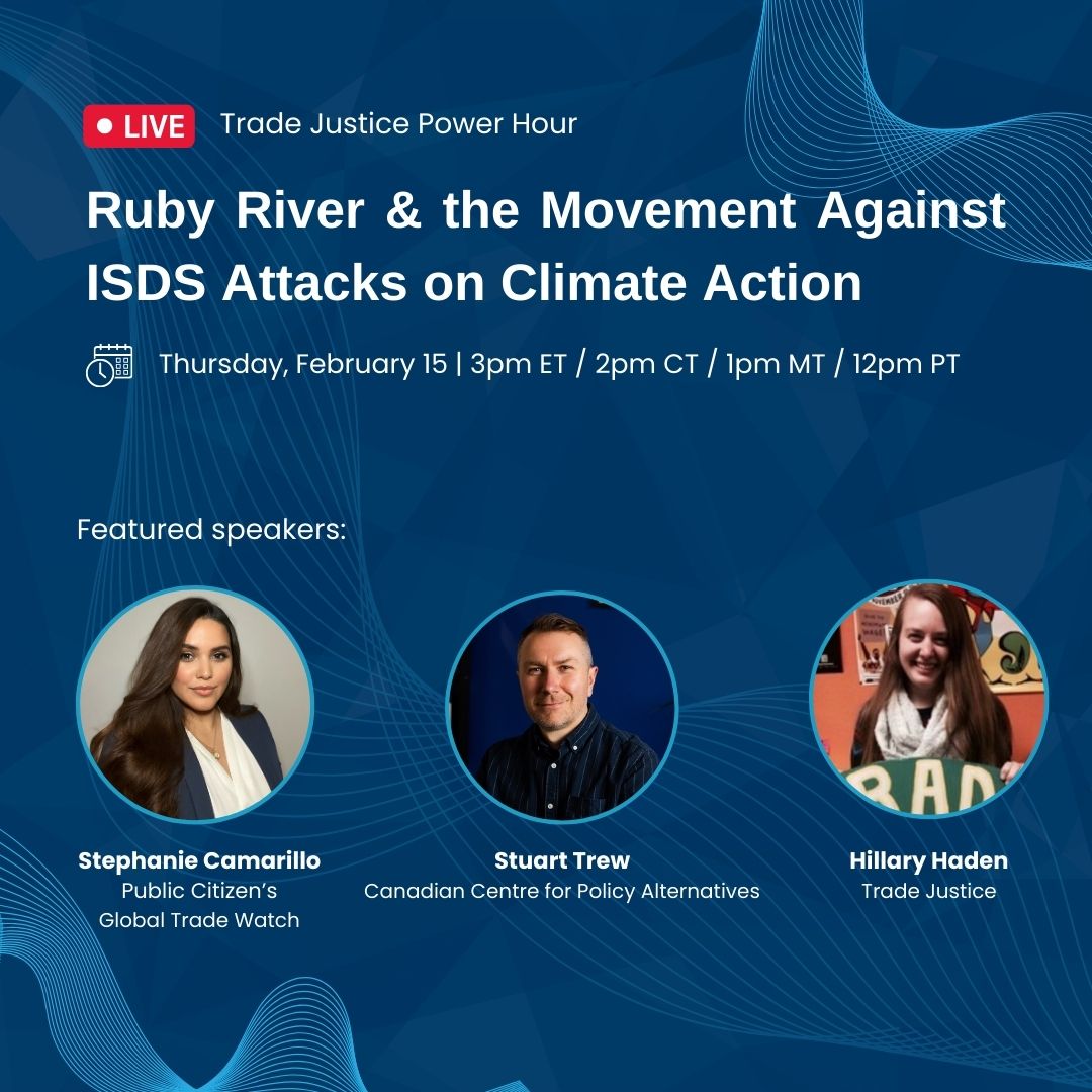 In this month’s Trade Justice Power Hour, join us as we explore the implications of ISDS for climate action and how you can participate in the global movement to dismantle the ISDS system once-and-for-all. Our presenters include: